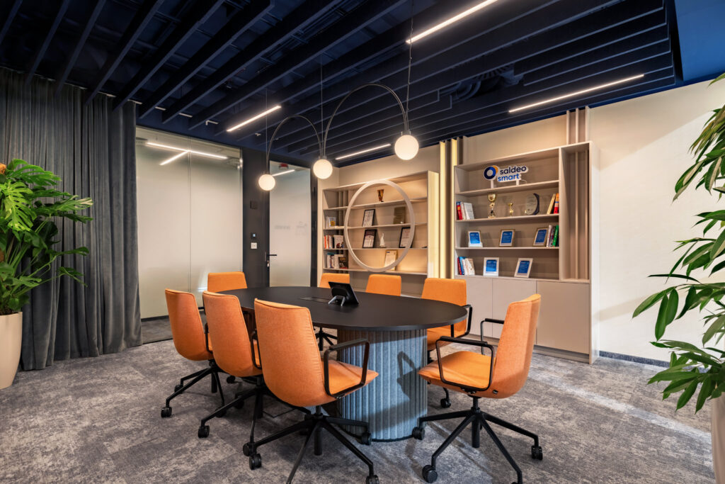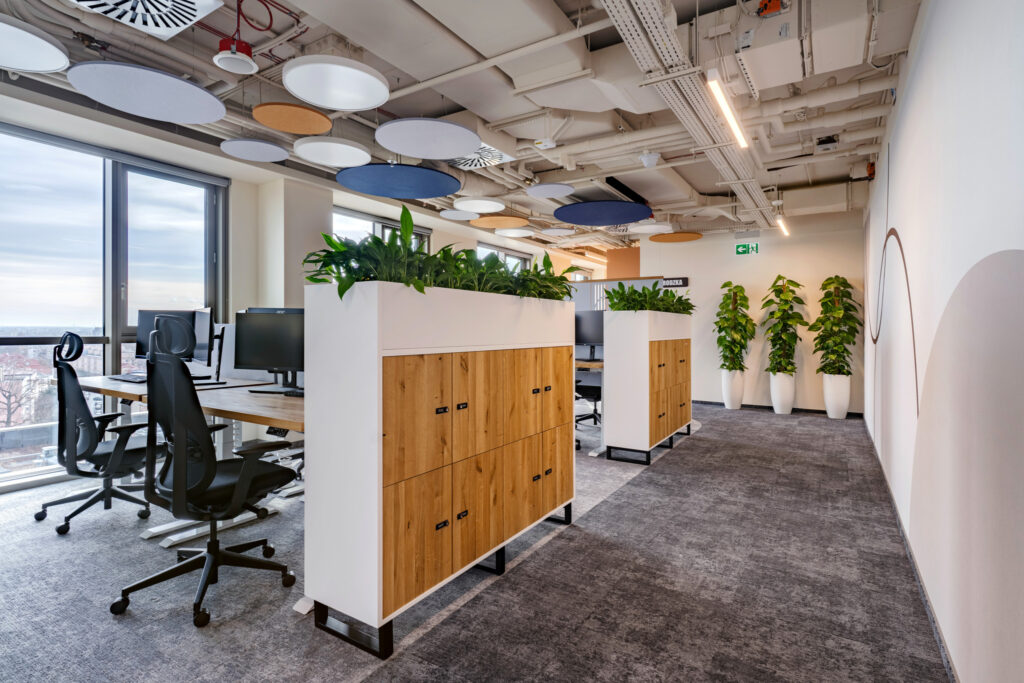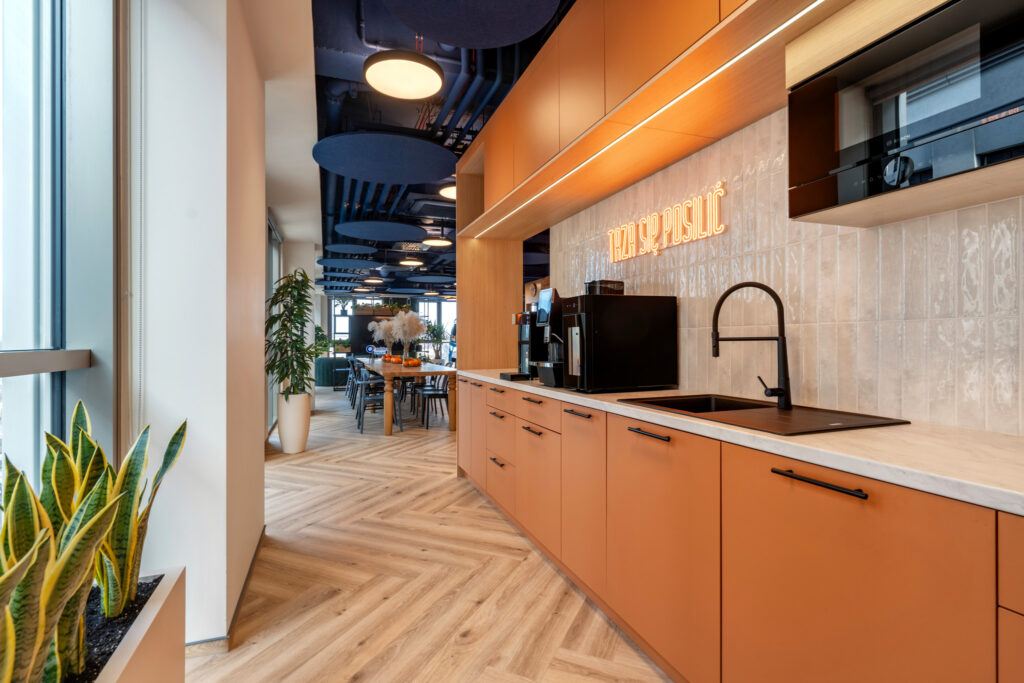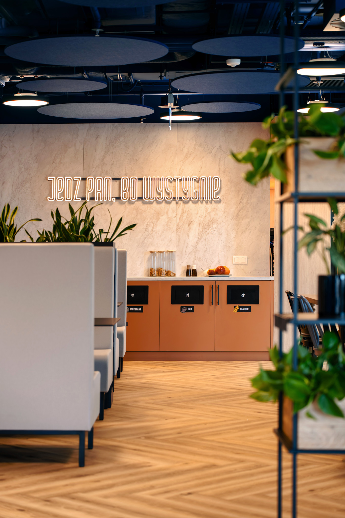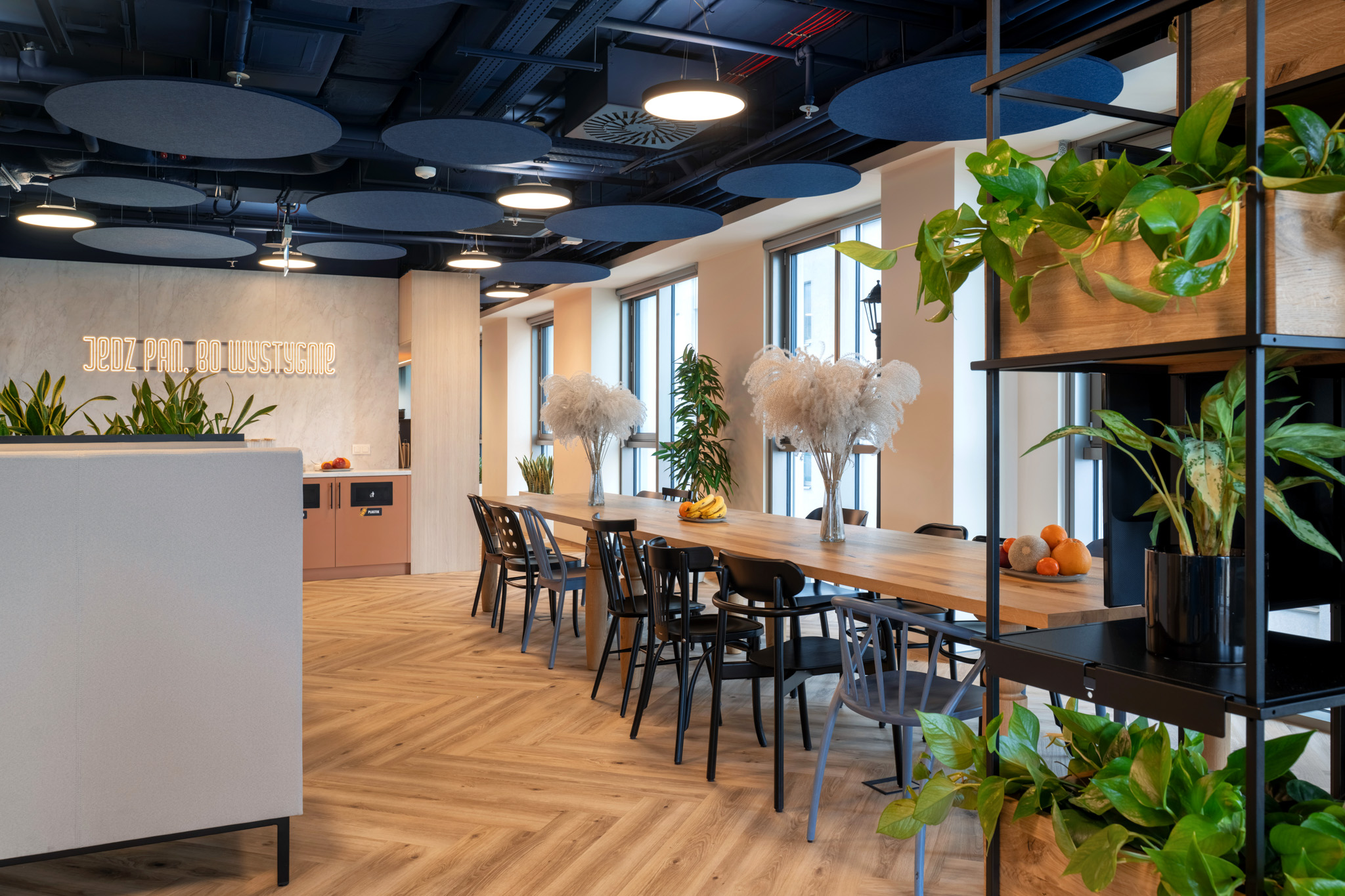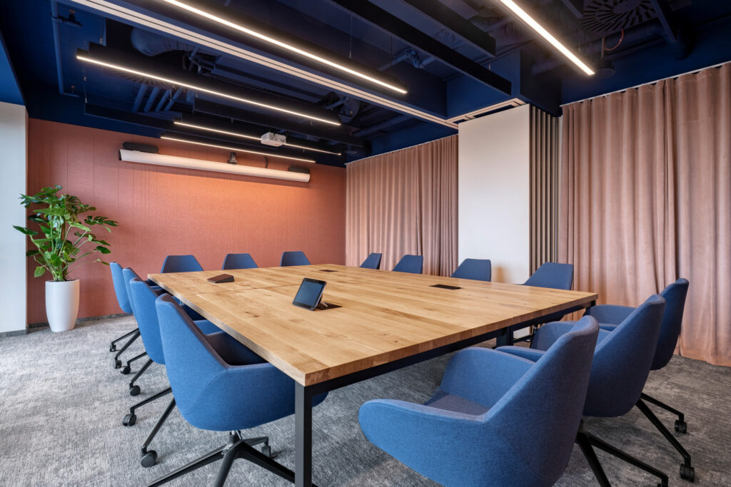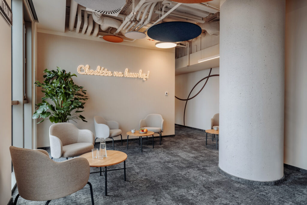 Projekt odpowiada na współczesny model pracy hybrydowej. Zamiast jednego dużego open space’u zaprojektowano mniejsze, wyraźnie wydzielone strefy pracy oraz wielofunkcyjne sale konferencyjne. Szczególny nacisk położono na komfort, akustykę i atmosferę. Efektem jest przestrzeń, do której pracownicy chętnie wracają – nie z obowiązku, lecz z wyboru.