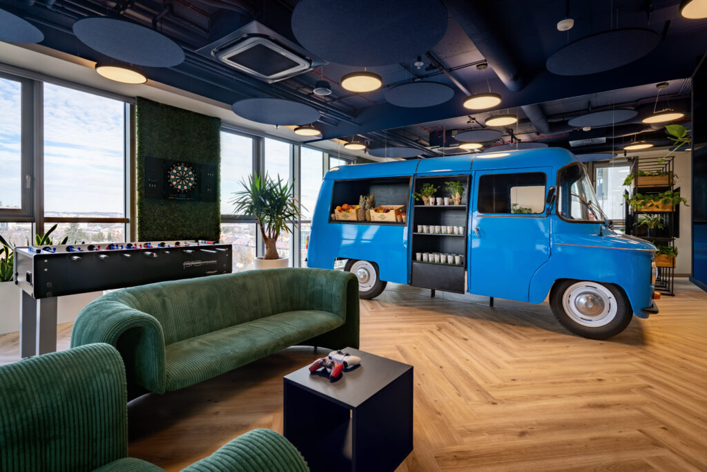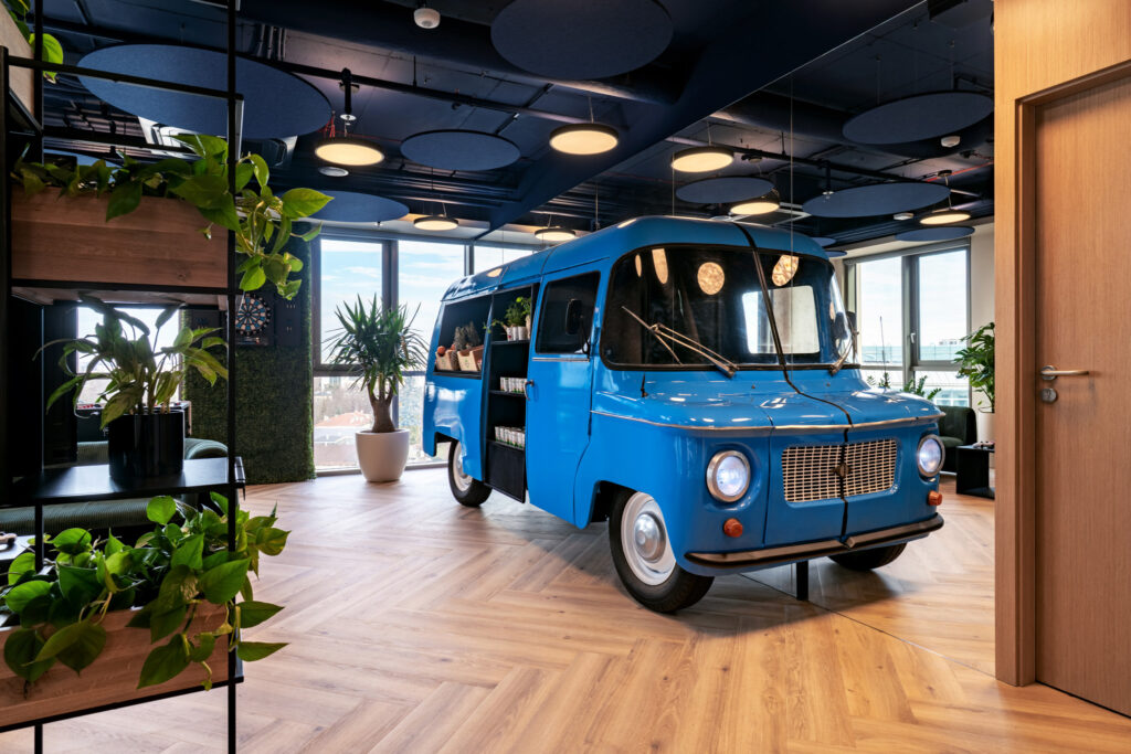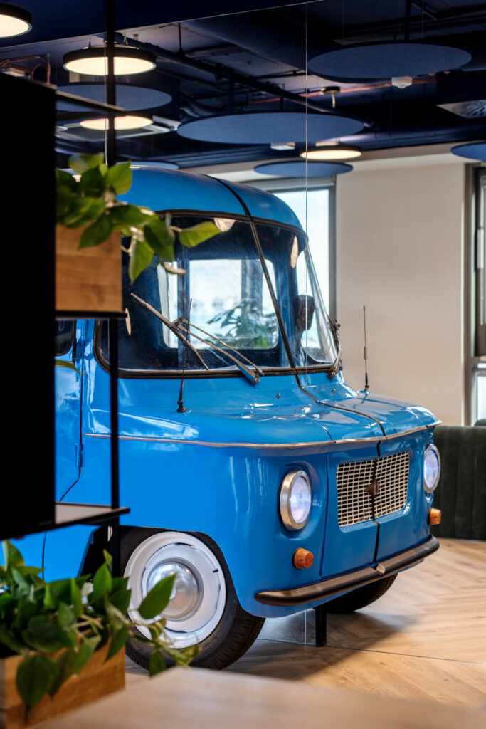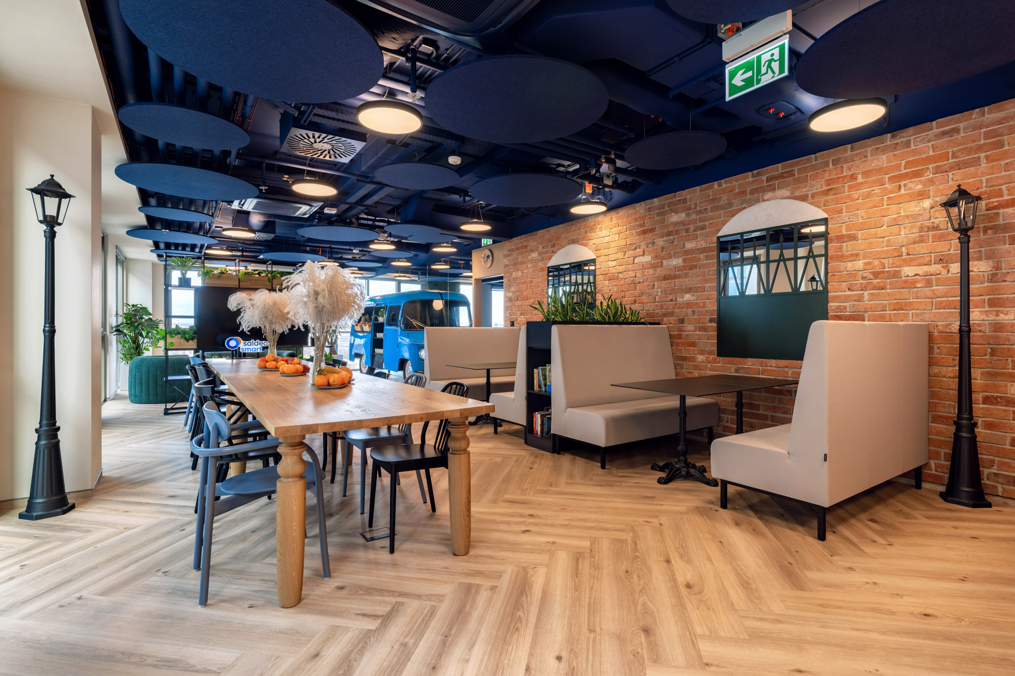 Lokalna tożsamość Krakowa została wykorzystana jako spójny język przestrzeni. Nazwy sal konferencyjnych i stref pracy nawiązują do dzielnic, ulic i symboli miasta, a kuchnia została zaprojektowana jako przestrzeń inspirowana klimatem krakowskiego Kazimierza i Placu Nowego. Jednym z najbardziej rozpoznawalnych elementów biura jest fragment niebieskiej Nysy, nawiązujący do kultowego miejsca pod Halą Targową – nocnego punktu spotkań mieszkańców miasta.