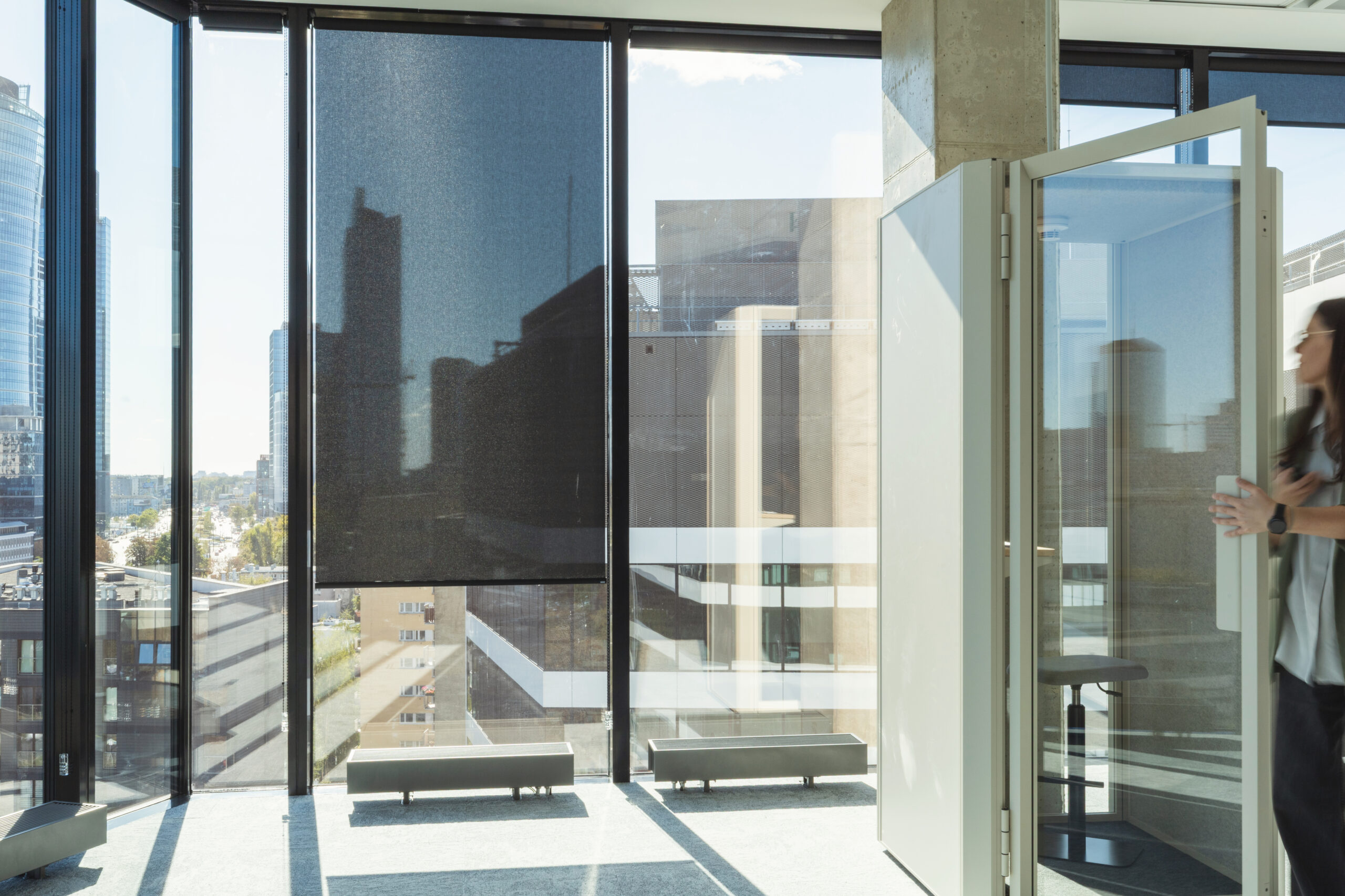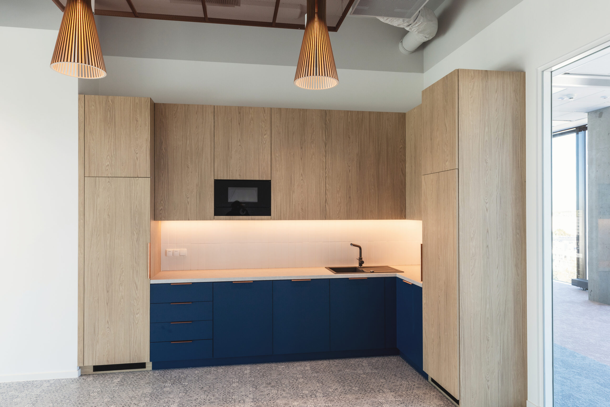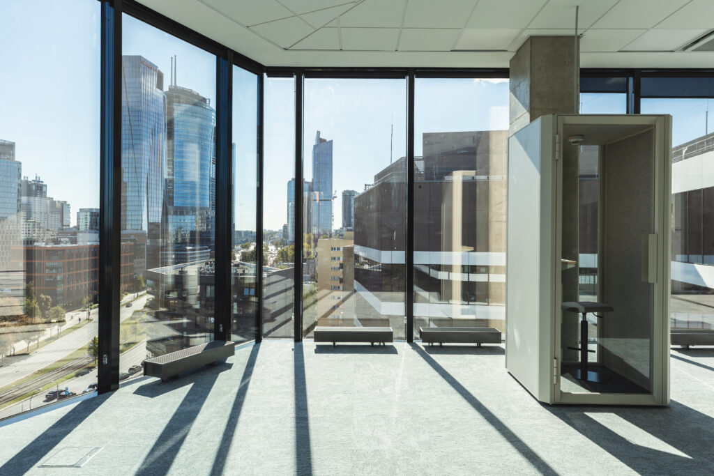 Strefa socjalna, mimo braku bezpośredniego dostępu do elewacji, została otwarta wizualnie na dwie strony budynku dzięki przeszklonym podziałom i przemyślanej organizacji przestrzeni.