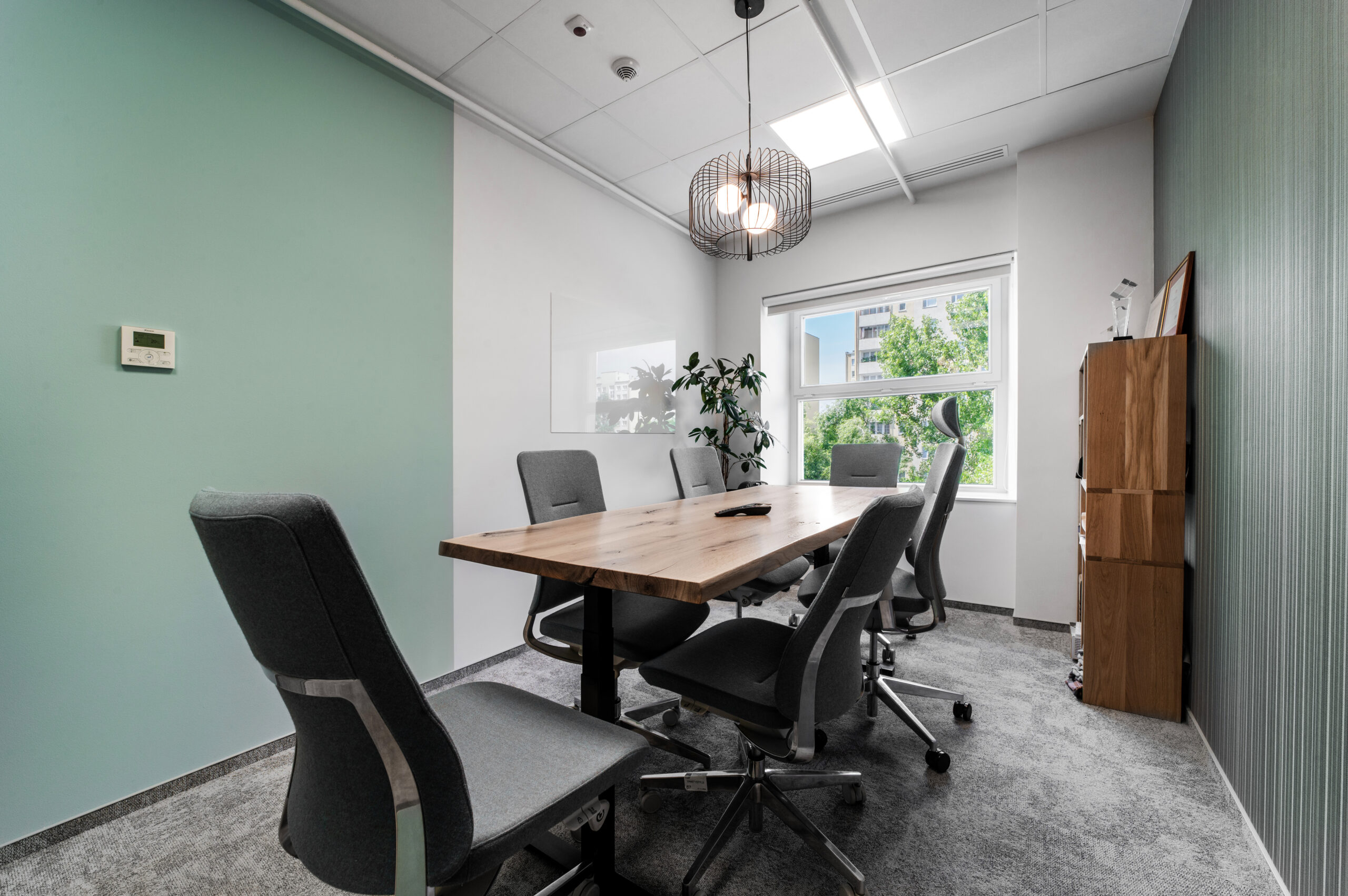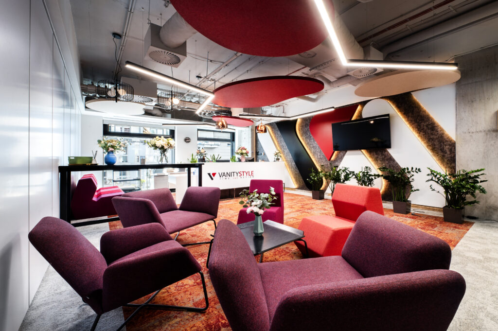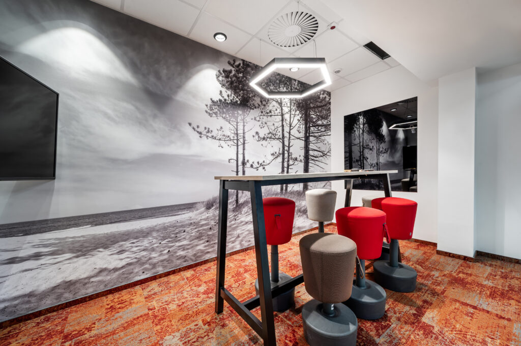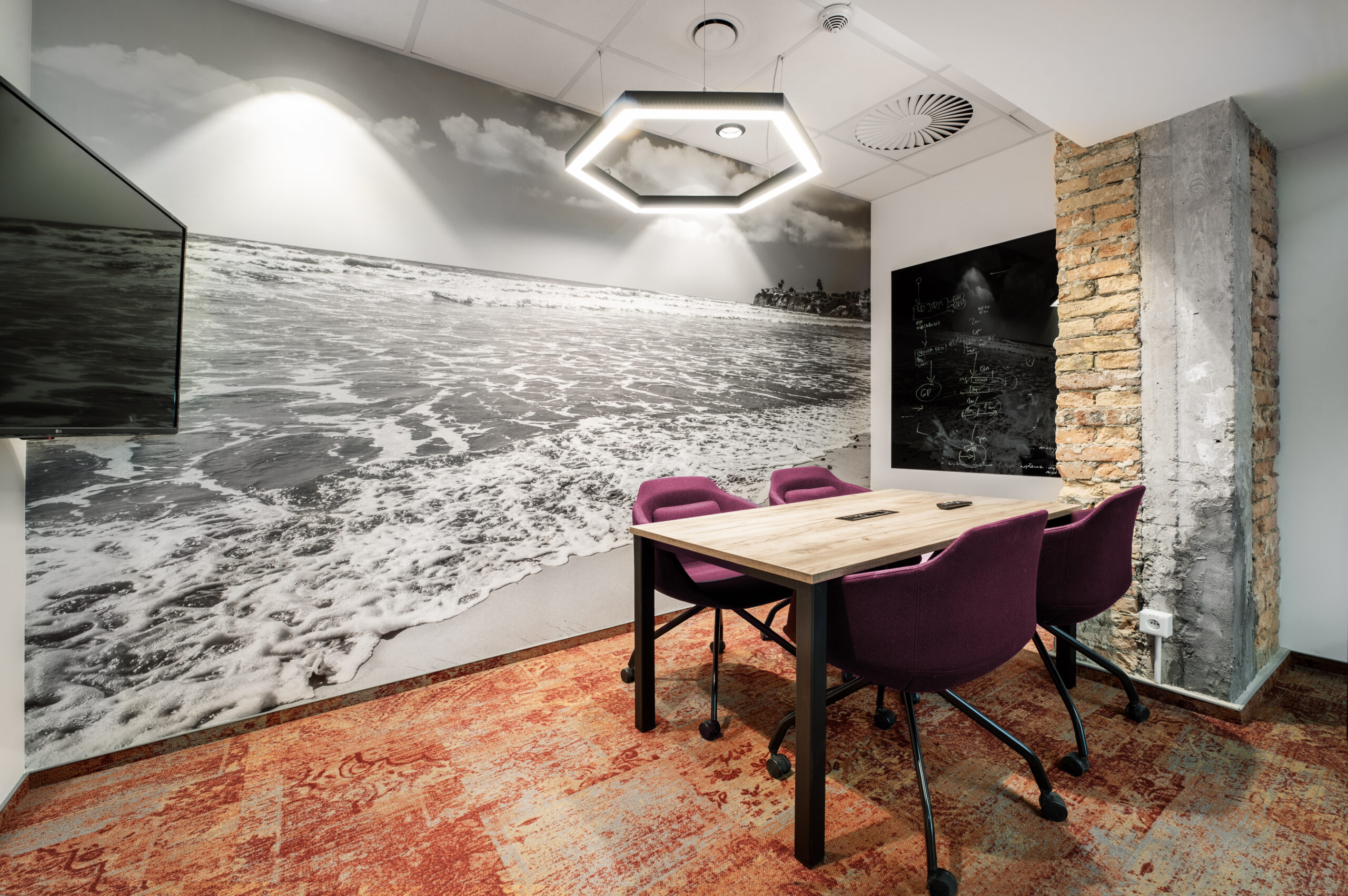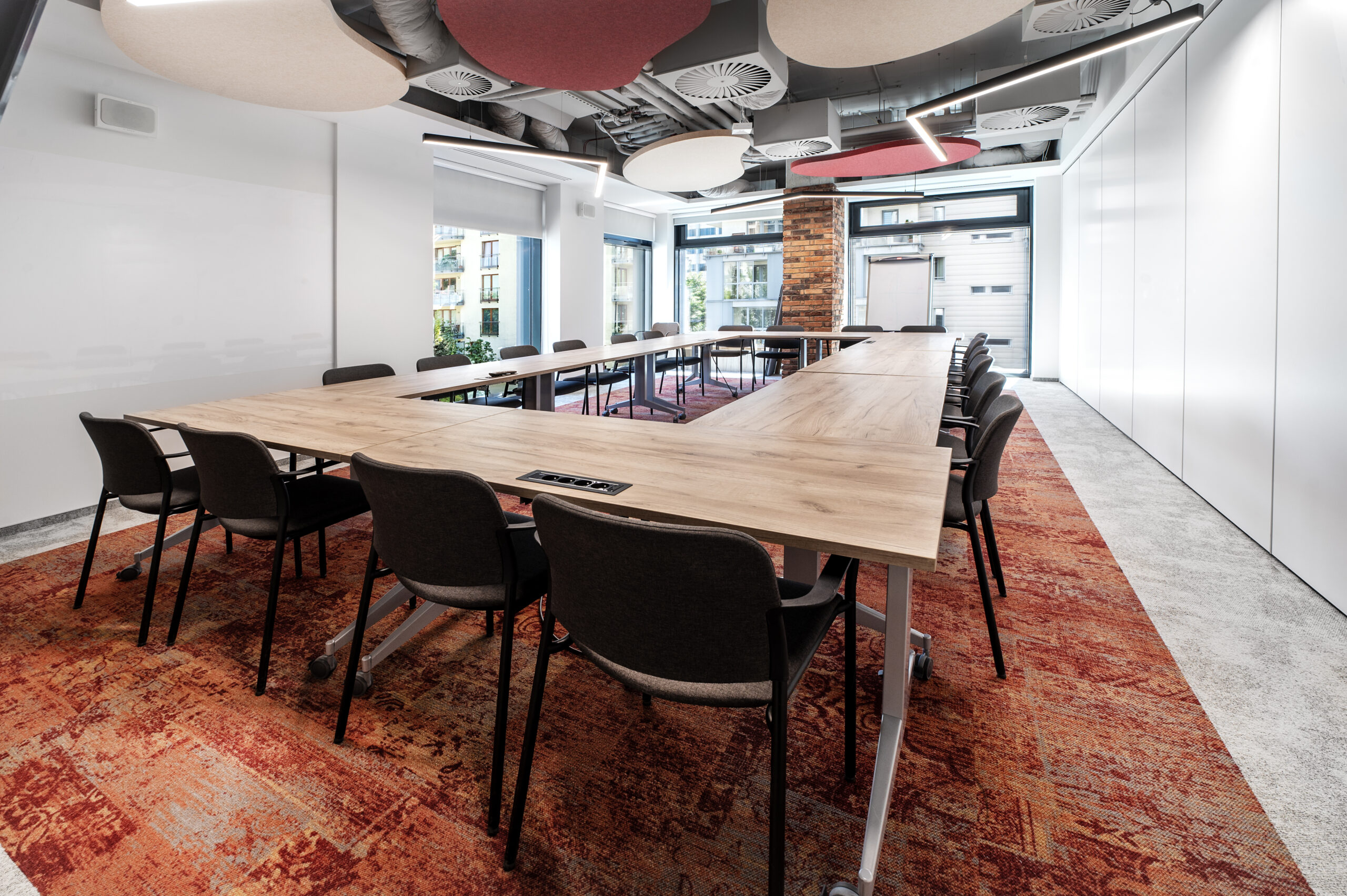 Duży nacisk położono na akustykę w biurze typu open space. Zastosowano nieregularne panele akustyczne montowane na suficie, wykładzinę o wysokim współczynniku pochłaniania dźwięku oraz tapicerowane panele ścienne. Rozwiązania te skutecznie ograniczają hałas i poprawiają jakość codziennej komunikacji zespołu.