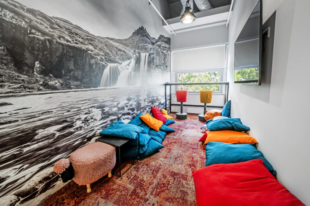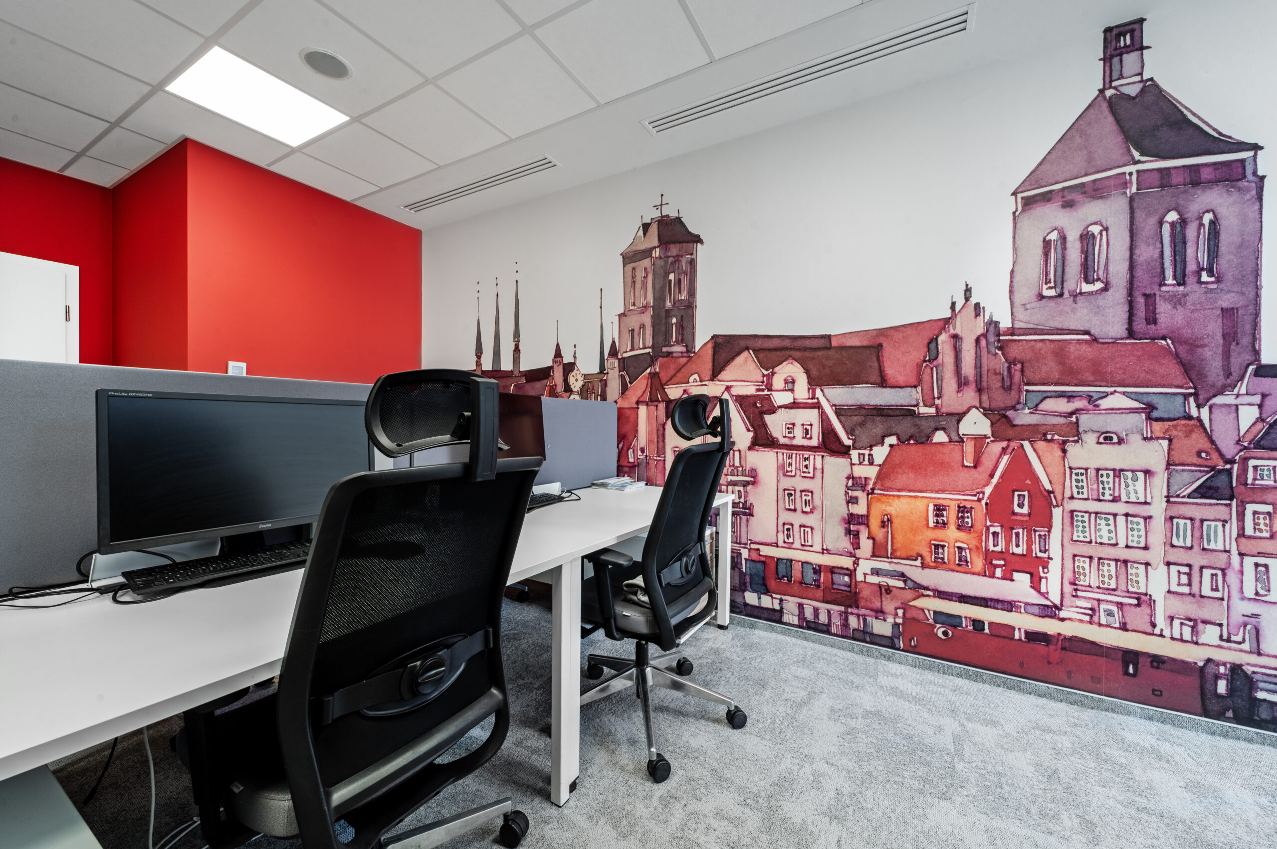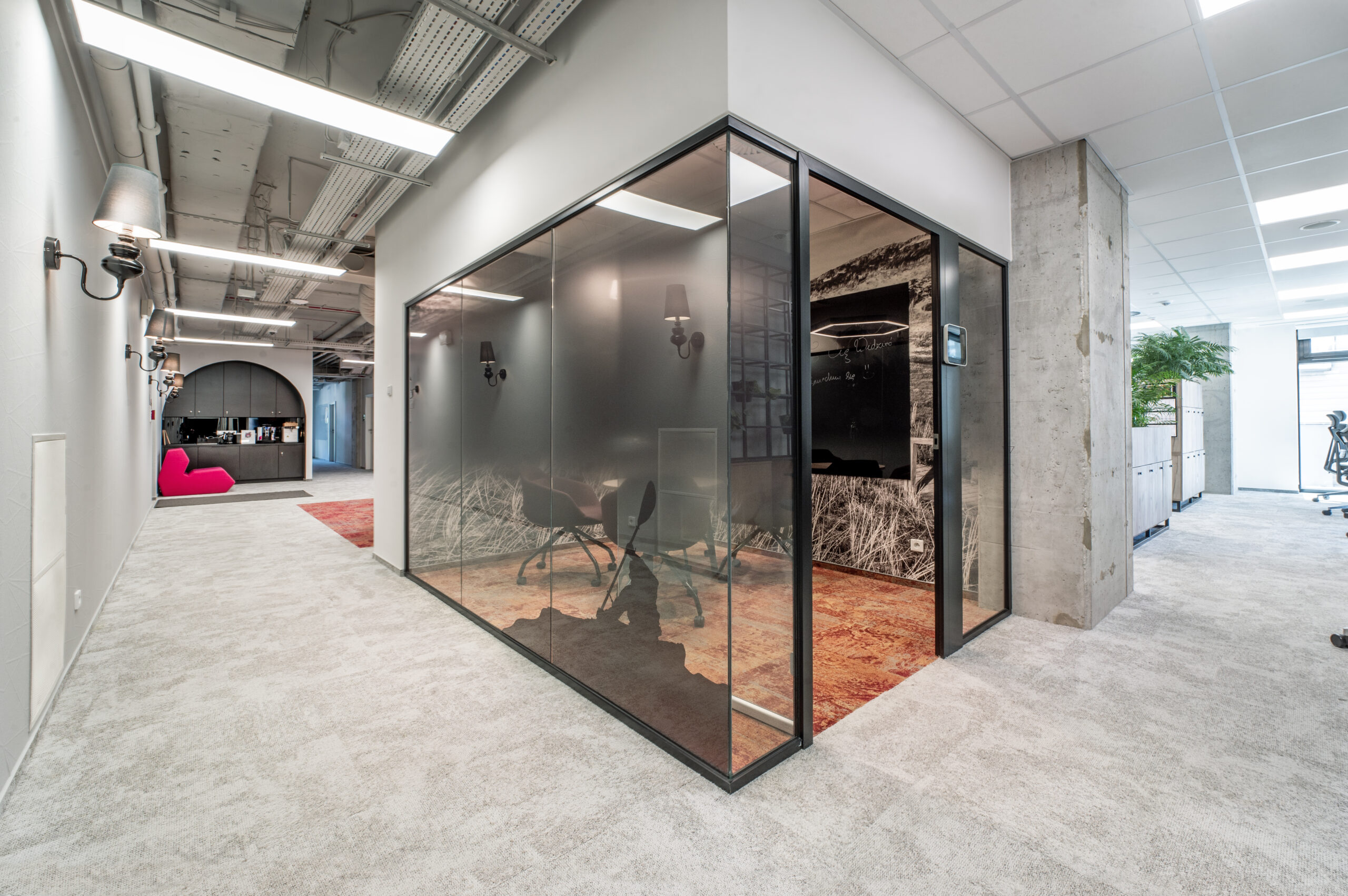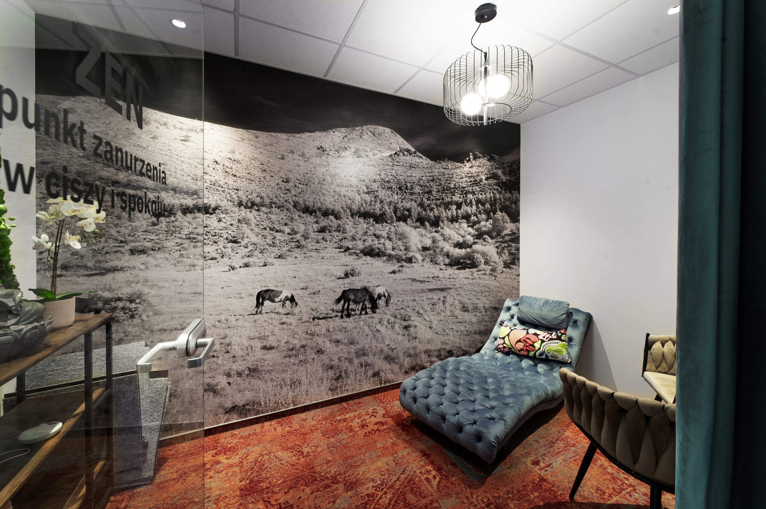 Duży nacisk położono na akustykę w biurze typu open space. Zastosowano nieregularne panele akustyczne montowane na suficie, wykładzinę o wysokim współczynniku pochłaniania dźwięku oraz tapicerowane panele ścienne. Rozwiązania te skutecznie ograniczają hałas i poprawiają jakość codziennej komunikacji zespołu.