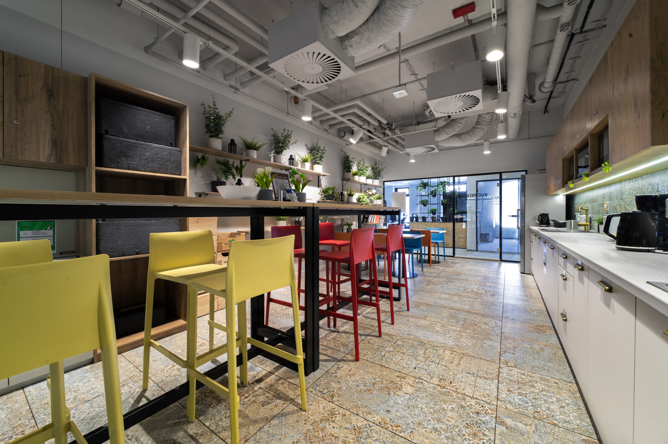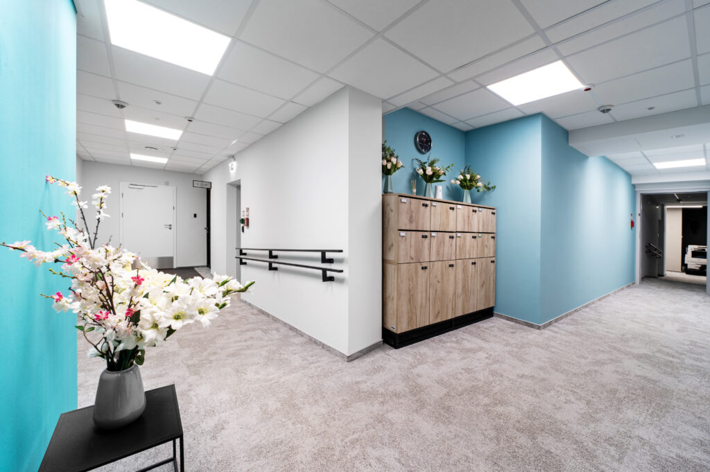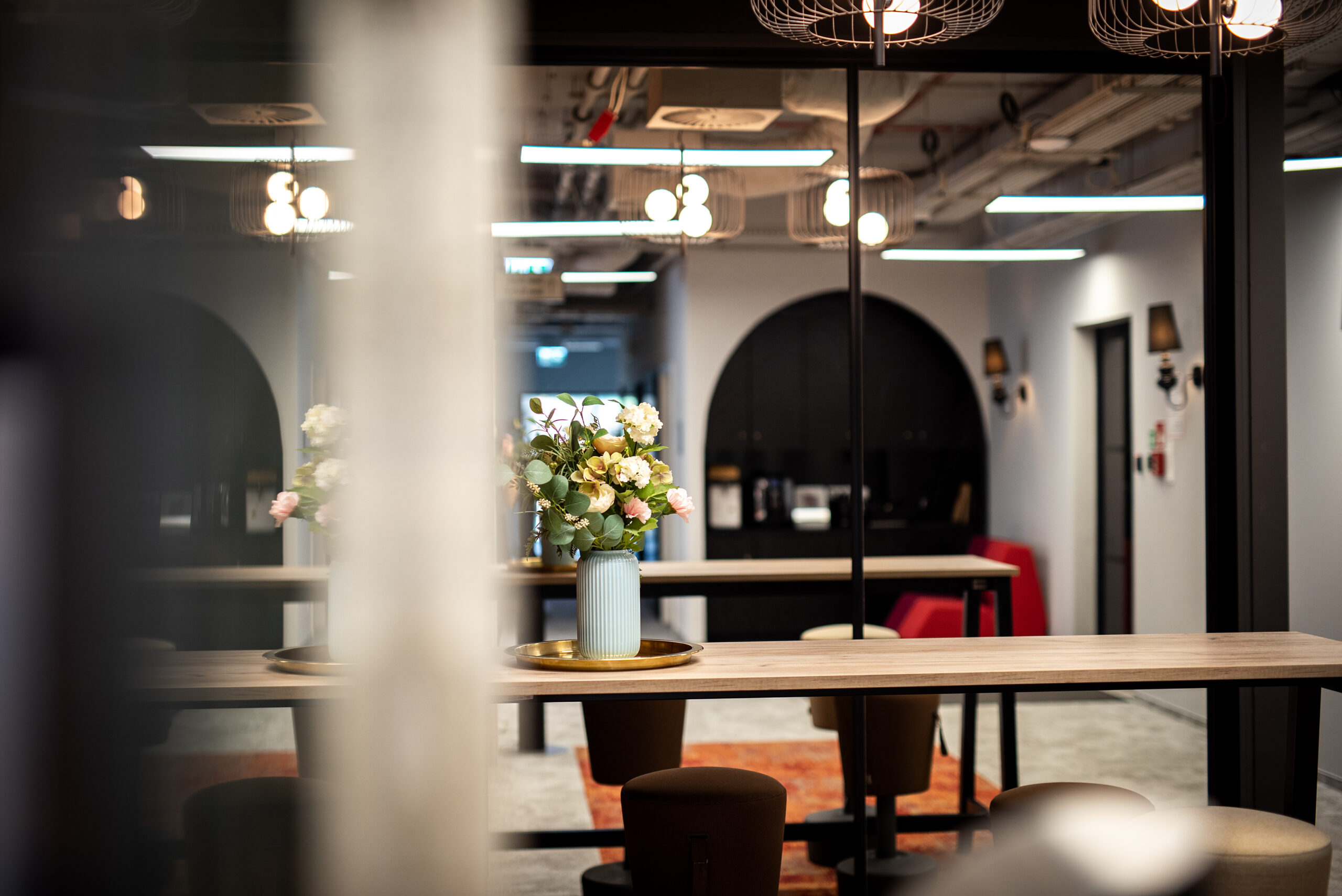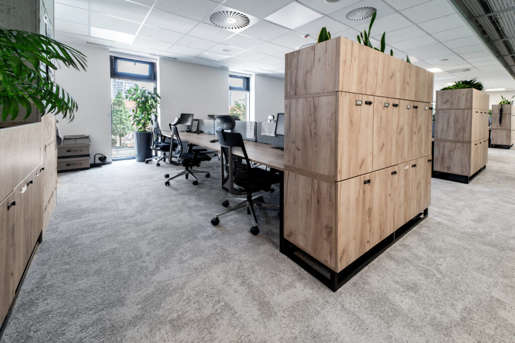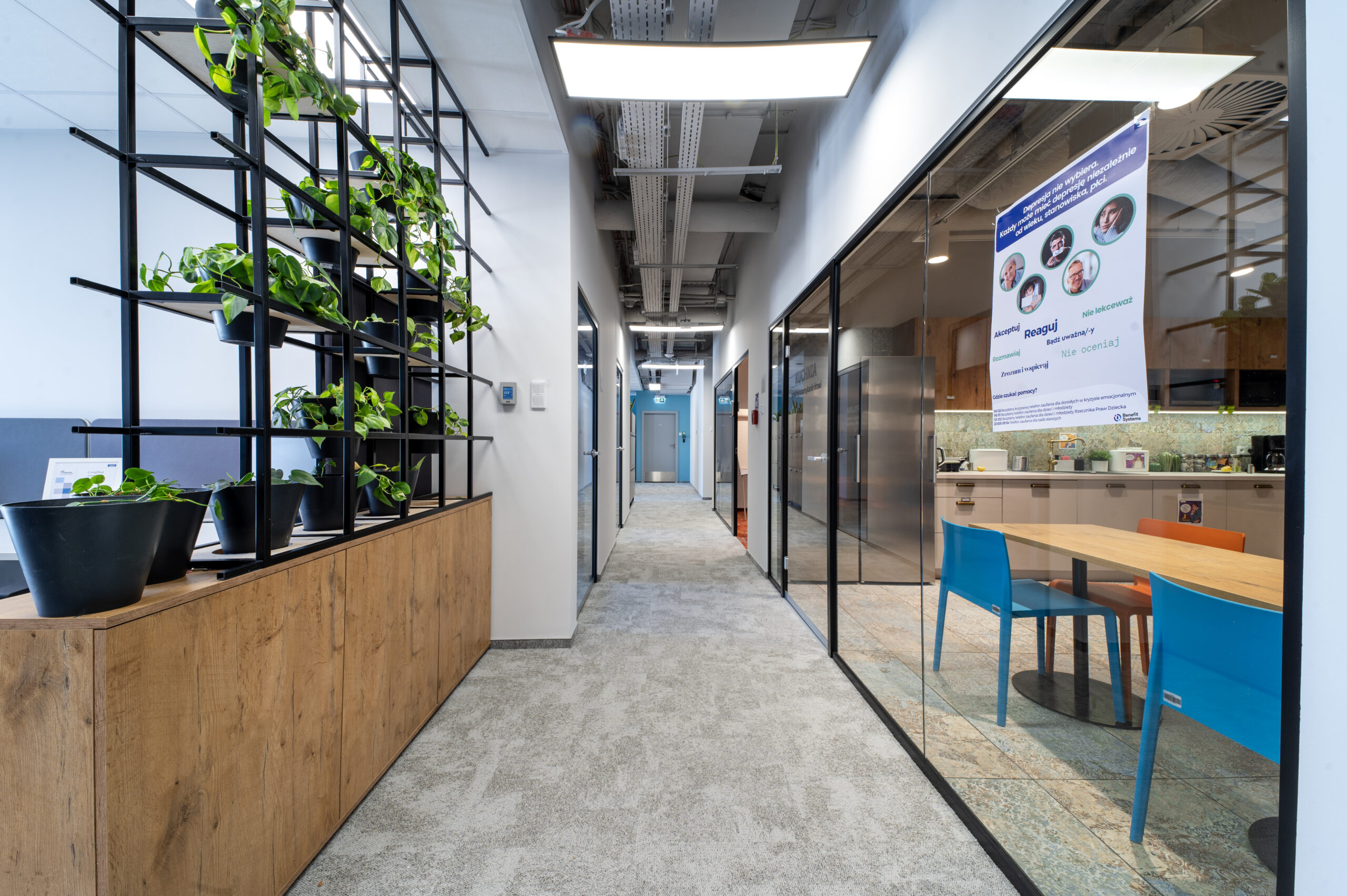 Uzupełnieniem aranżacji są rośliny, drewno oraz subtelne akcenty nawiązujące do profilu działalności firmy. Efektem jest funkcjonalne i nowoczesne biuro, które wspiera koncentrację, integrację zespołu oraz dobre samopoczucie użytkowników każdego dnia.